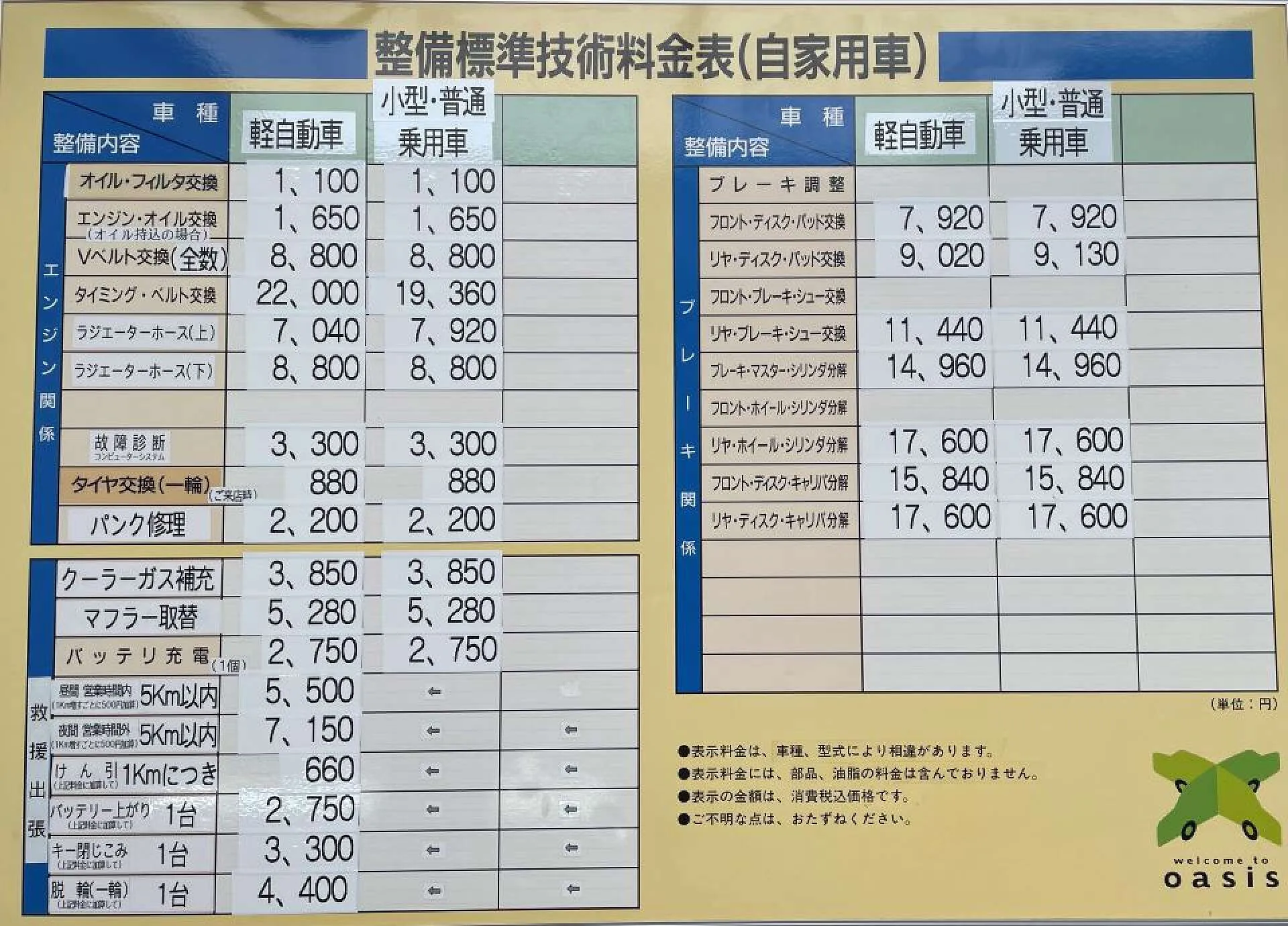 ・表示料金には、部品、油脂の料金は含んでおりません。